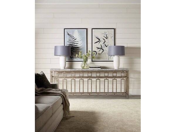 Console table pairing an airy geometric metal base with an organic stone veneer top. A champagne finish with silver and gold tones adds subtle texture for refined living room style.