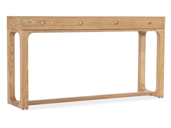Console table in light natural pecan veneer with pewter oval knobs. 64 in. wide with four drawers for convenient storage.