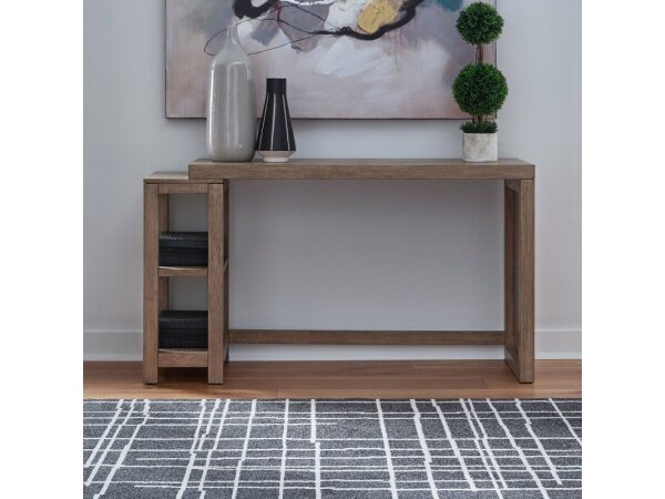Crafted from Rubberwood solids and White Oak veneers, this console table features a distinctive layered top and an open bookshelf with an adjustable shelf. Its versatile design allows it to function as a console or a bar table with seating for two.