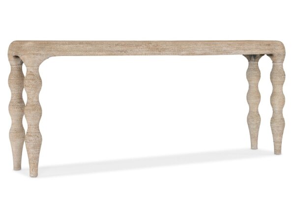 Coastal console table with oak veneers in a wire-brushed Surf finish and whitewashed rope-wrapped legs. Slim 15 in. depth fits tight entryways and hallways.