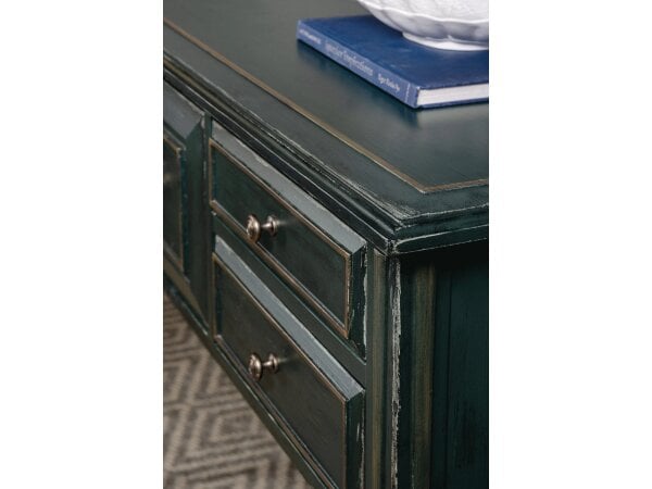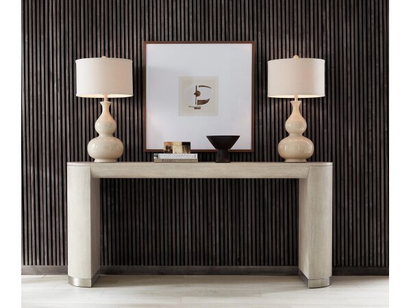 The Heatherbrook console bar table, crafted from poplar solids and acacia veneers with a charcoal and ash finish, includes two electrical outlets and USB ports for charging. It also features open grid end panels and a block leg design, fitting well behind