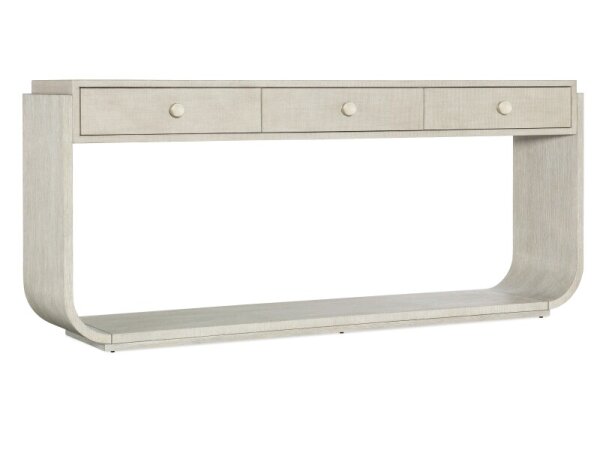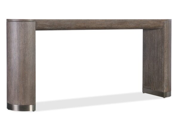 The Heatherbrook console bar table, crafted from poplar solids and acacia veneers with a charcoal and ash finish, includes two electrical outlets and USB ports for charging. It also features open grid end panels and a block leg design, fitting well behind