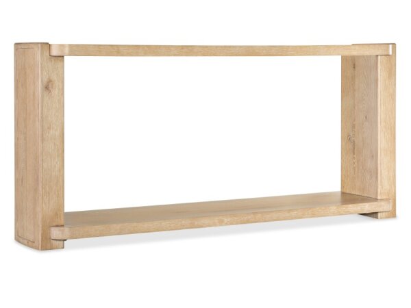 The Heatherbrook console bar table, crafted from poplar solids and acacia veneers with a charcoal and ash finish, includes two electrical outlets and USB ports for charging. It also features open grid end panels and a block leg design, fitting well behind