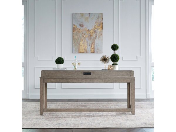 This Skyview Lodge console bar table, crafted from Rubberwood solids and White Oak veneers with a Cobblestone finish, features X-reclaimed side panels and built-in storage. It includes a charging station with 2 AC outlets, 1 USB-A, and 1 USB-C port.