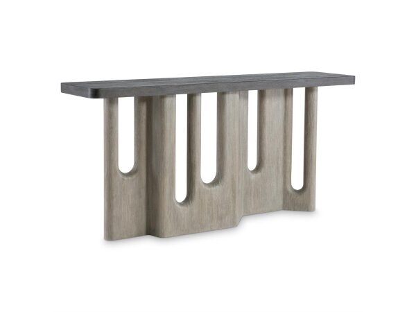 This Skyview Lodge console bar table, crafted from Rubberwood solids and White Oak veneers with a Cobblestone finish, features X-reclaimed side panels and built-in storage. It includes a charging station with 2 AC outlets, 1 USB-A, and 1 USB-C port.