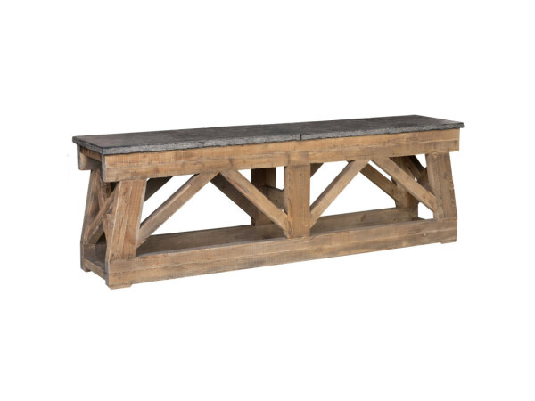 Console table with a stone veneer top over a sculptural tree-branch base in light Pecan veneers. An organic, airy accent for entryways or behind a sofa.