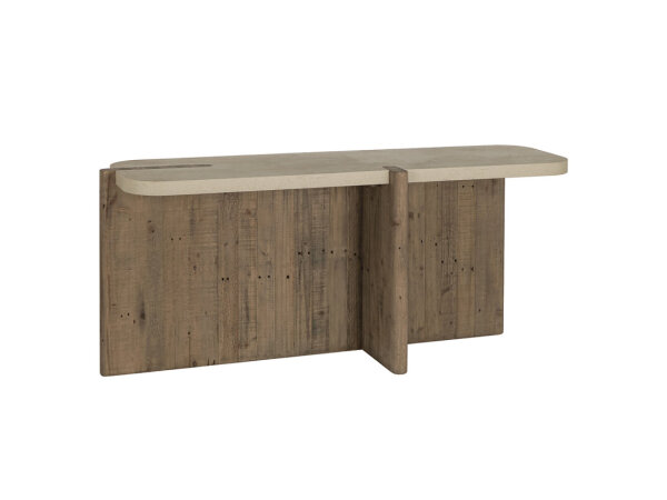The Durant Occasional Set features sustainable reclaimed pine with FSC certification, combining a modern concrete-inspired surface with industrial detailing. Its