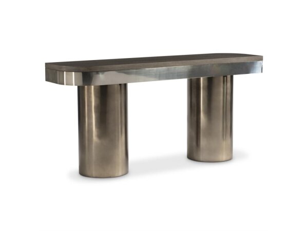 Stainless steel and wood take a new angle for this dramatic console table design.