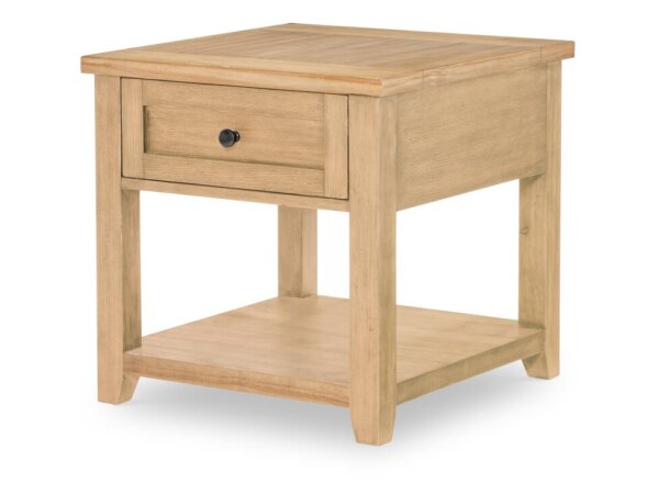Rectangular end table with open storage and a removable bottom tray for versatile organization. Quartered oak veneers in a Polished Limestone finish suit modern living rooms.