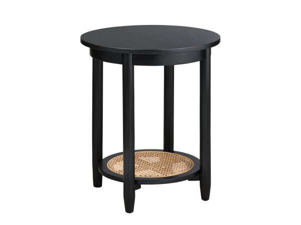 Rectangular end table with a stainless steel frame, glass top, and a wood-framed cane shelf. Two shelves add open storage in a clean, transitional design.