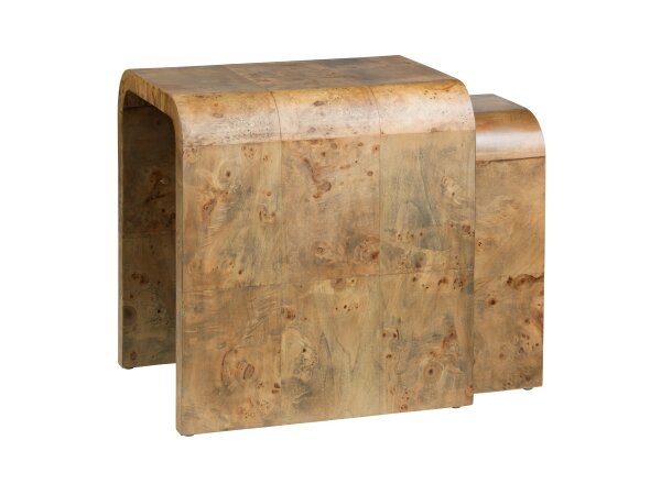 Traditional end table in dark walnut veneer with ultra-white tempered glass, accented by champagne trim and a round knob. A drawer and lower shelf offer handy storage.