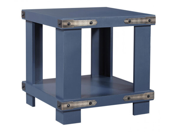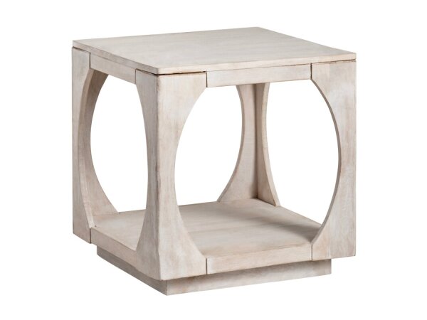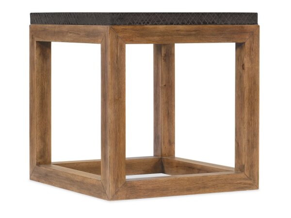 Square end table pairs a Vintage Natural wood base with a charcoal Furrowed Bark crosshatch top. Wood-and-resin construction delivers a grounded, beam-inspired look for living rooms.