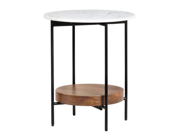 This Stella accent end table is constructed from hand-carved solid mango wood with a powder-coated black metal base. Its Boho styling provides a warm, vintage feel for your home.