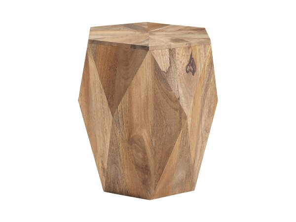 A contemporary end table crafted from Rubberwood solids and White Oak veneers with a Bark finish. It features over-scaled rectangular legs and an open bottom shelf for storage or display.