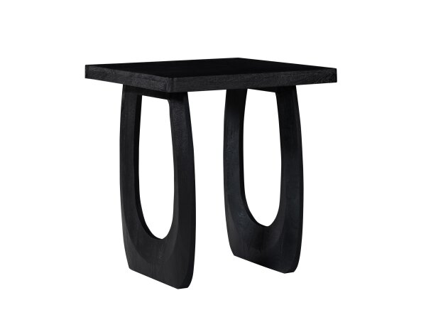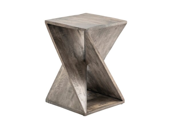 A contemporary end table crafted from Rubberwood solids and White Oak veneers with a Bark finish. It features over-scaled rectangular legs and an open bottom shelf for storage or display.