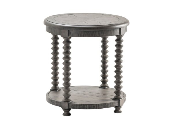 This European-designed round end table is crafted from poplar solids with white oak and birch veneers, showcasing an antique white and weathered bark finish. It features a fancy face top and a unique scrolled pedestal base with bracket feet.