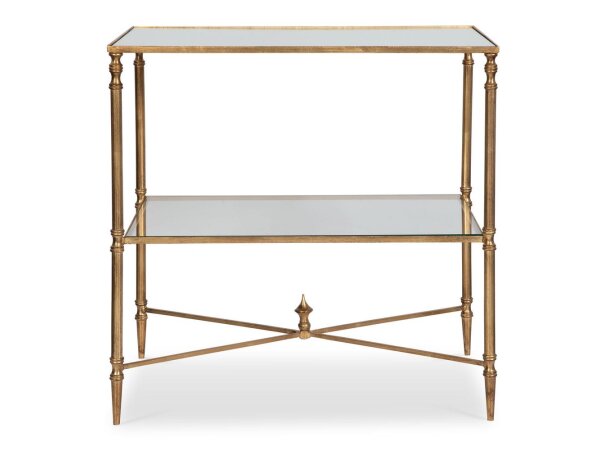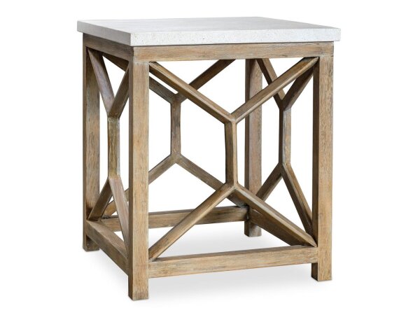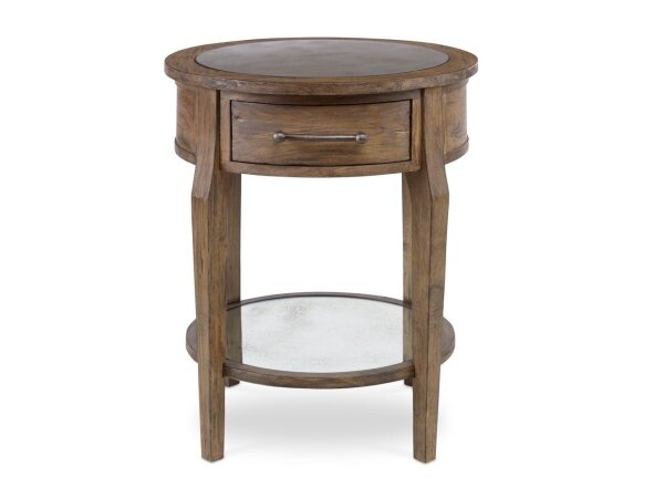 This European-designed end table is crafted from poplar solids with white oak and birch veneers, featuring an antique white and weathered bark finish. It includes a full extension drawer and a bottom shelf for convenient storage.