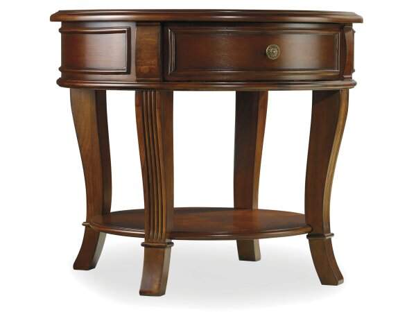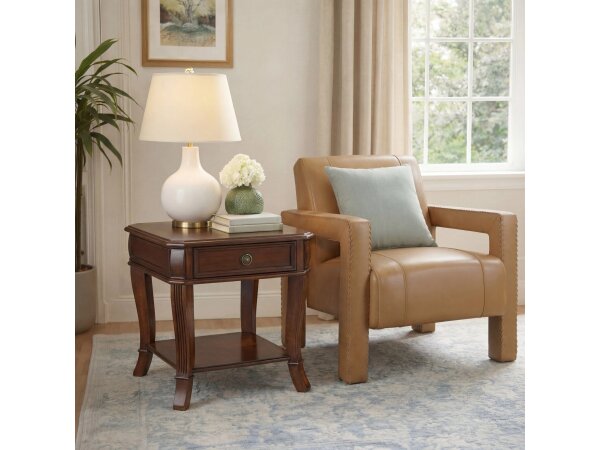 Traditional end table in distressed cherry with a decorative veneer top. Includes one drawer and one shelf with brass-finished hardware and fluted legs.