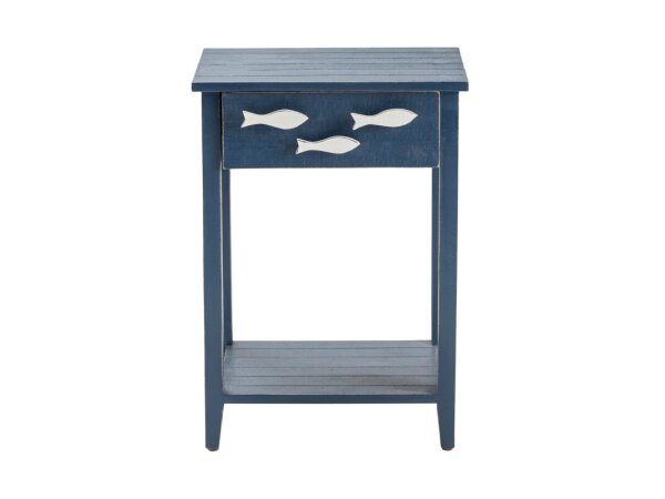 Crafted from poplar solids and white oak veneers with a weathered bisque finish, this end table features a fancy face veneer top and a storage drawer with bead molding. It also offers an open bottom shelf for additional storage or display.