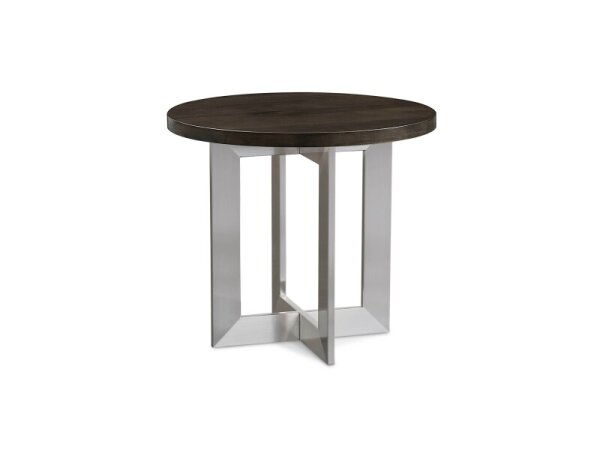 End table featuring a sleek champagne‑brass angular metal base and solid American maple for a refined, handcrafted look. Hidden levelers; 25 in. H x 28 in. W x 28 in. D.