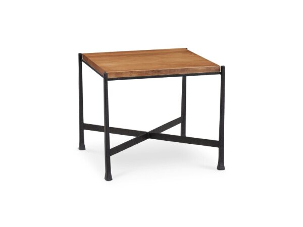 End table with a solid American maple top and textured cast iron X-base in an ebony powder-coated finish. Hidden levelers keep it steady; 25 in. W x 25 in. D x 25.5 in. H.
