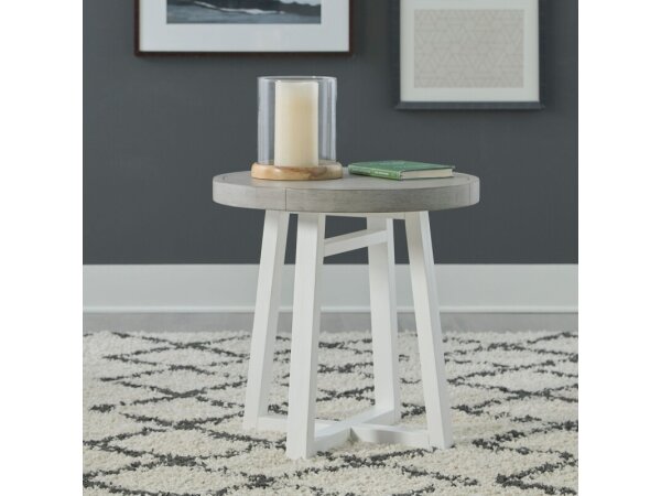 Crafted from rubberwood solids and white oak veneers, this round end table features a two-tone Driftwood and Shell White finish. It has an open pedestal base for a clean, contemporary feel.