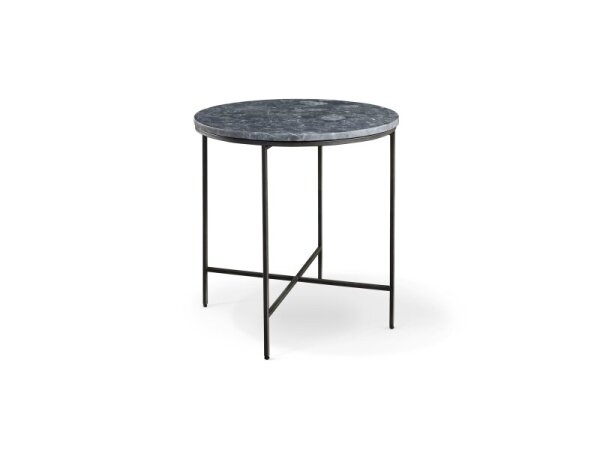 Round end table pairing a natural stone top (Chocolate Travertine or Black San Luis) with a cast-iron base in dark pewter. 24 in. diameter surface with levelers for stability.