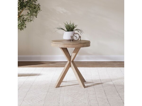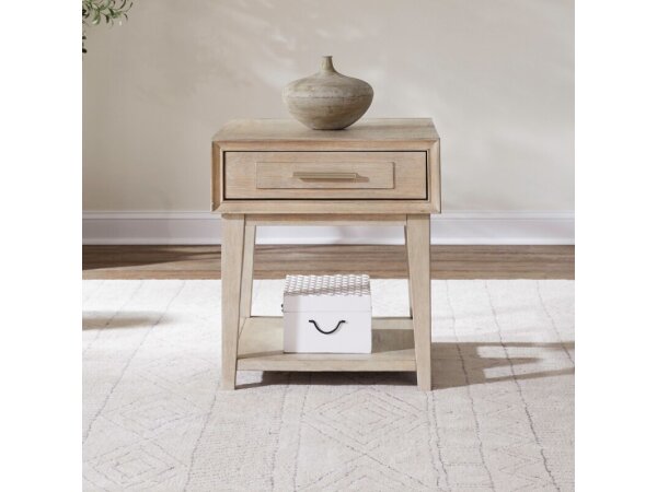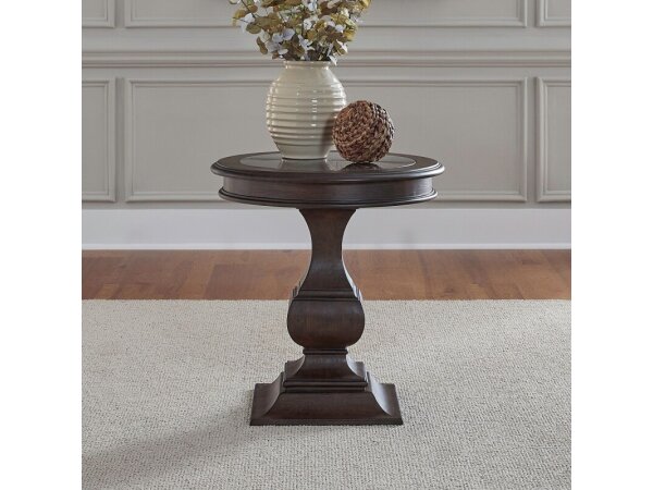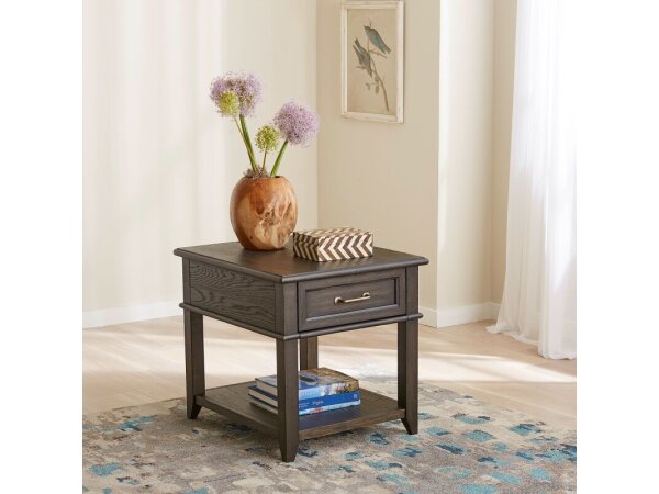 Crafted from rubberwood solids and white oak veneers with a Satin Espresso finish, this round end table features a starburst veneer top and three storage drawers. It rests on a distinctive inset round plinth base, blending artistry with practicality.