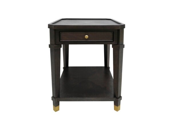This end table combines storage and style, featuring a drawer with a flat cut front and an open bottom shelf. Crafted with Rubberwood solids and a 4-way matching veneer top, its design is completed by elegant tapered legs.
