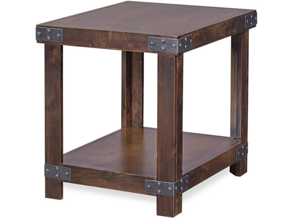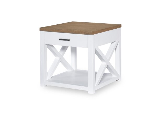 Crafted from Poplar solids and Oak veneers with a Weathered White finish, this Lake House end table features a planked top, a bottom shelf, and a storage drawer with Antique Brass hardware. It boasts a multi-step hand-applied finish and tapered legs.