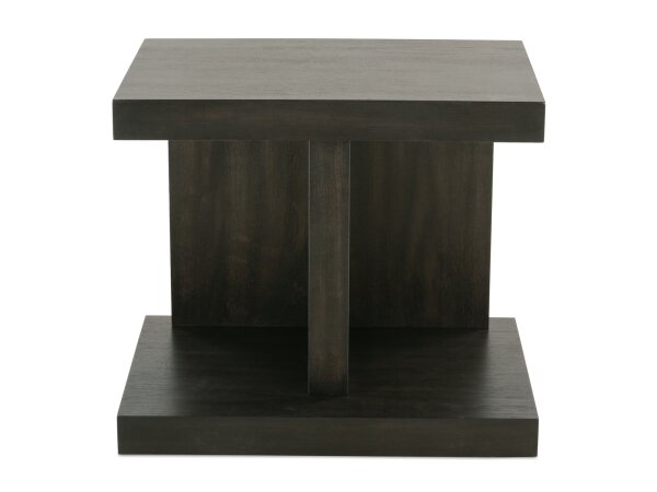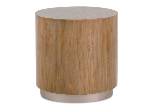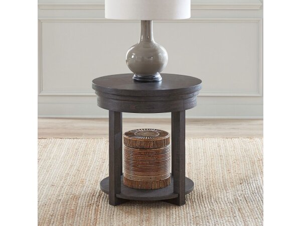 This end table offers both concealed and open storage with a single drawer and a bottom shelf. It features a flat cut drawer front with satin pewter bar pull hardware and softly shaped legs.