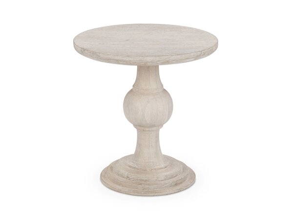 A classic round end table featuring a bottom shelf for display or storage. Its design is defined by inset block legs and a heavy wirebrushed finish for a textured, rustic appeal.