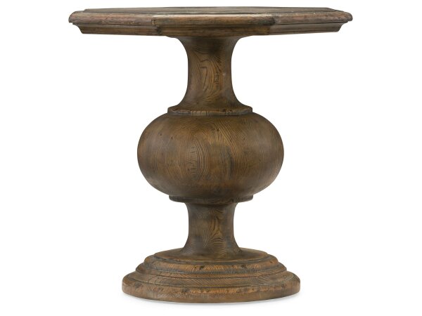 This end table is crafted from pine solids and veneers with a distressed two-tone Riverstone White and Tobacco finish. It features a full extension drawer with Antique Pewter knob hardware and heavy, multi-turned legs.