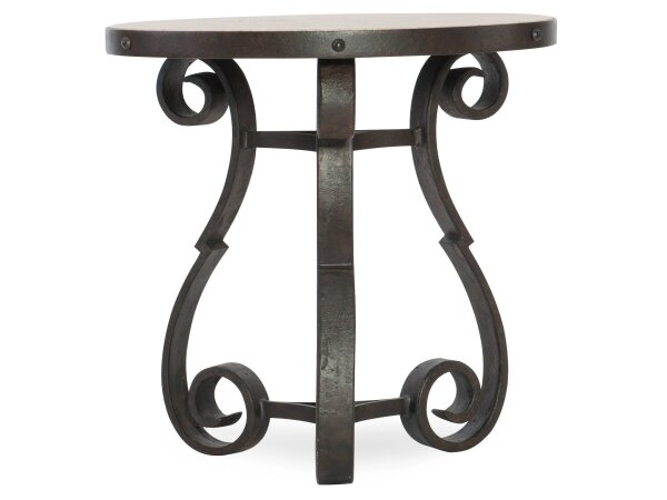 Round end table with acacia wood top and lower shelf featuring a starburst veneer in a golden brown finish on a sturdy metal frame. Transitional living room table adds handy storage.