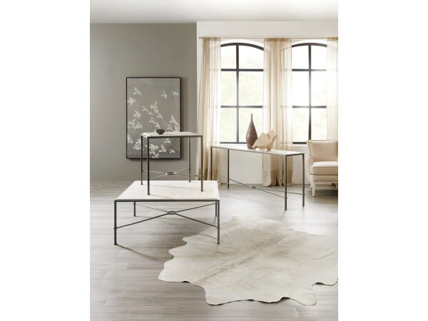 End table features a dark charcoal textured metal frame and X-stretcher topped with a creamy beige marble surface. A compact side table suited to transitional spaces.