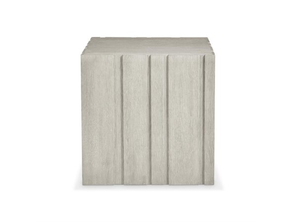 Square end table wrapped in raffia with woven-cane details and a Flax finish. A fixed lower shelf offers handy storage for living room essentials.