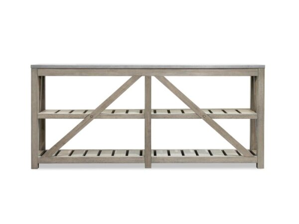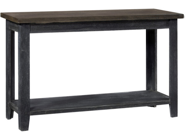 This Mill Creek sofa table is crafted from rubberwood solids and white oak veneers with a Peppercorn finish. It features two full extension drawers and two open bottom shelves with included sea grass baskets for versatile storage.
