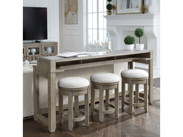 This 4-piece set includes a console bar table with a unique tile insert top and a built-in charging station. It comes with three swivel stools that feature padded, upholstered seats in textured porcelain fabric.