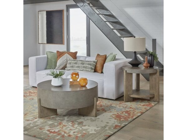 This beautiful Americana Farmhouse round cocktail ottoman features tufted linen with 100% polyester for durability and heavy turned legs with tulip feet. Wood trim detail adds a deconstructed design element.
