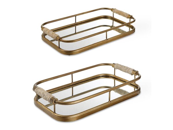 Set of two metal trays are finished in brushed gold with natural rope wrapped handles and mirrored bottoms. Sizes: S-17x3x10,