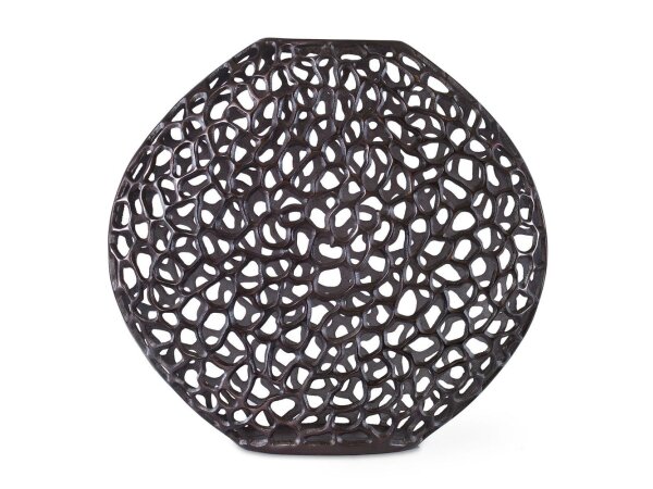 Crafted from cast aluminum, this vase showcases an intricate open frame design finished in dark bronze.