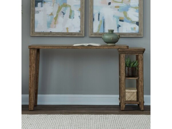 Crafted with Rubberwood solids and a Split Heart White Oak veneer top, this console table combines elegance with utility. It features a bookshelf on one end with an adjustable shelf, providing stylish storage and display space.