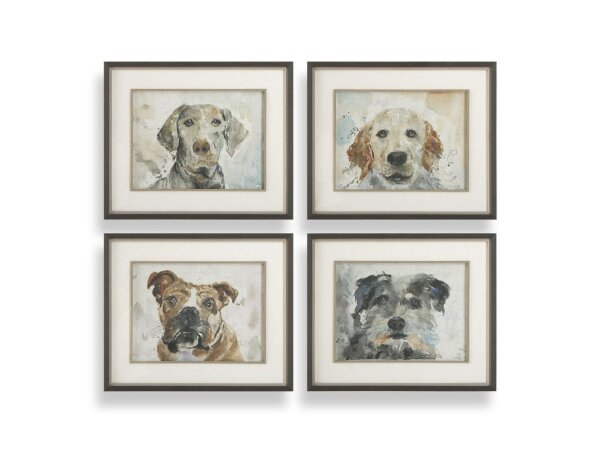 Each piece showcases an expressive canine portrait, brought to life with soft watercolor brushstrokes. Framed to perfection, each print features