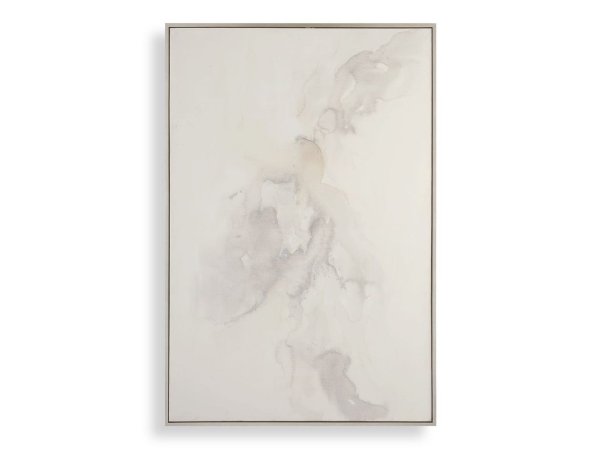 Delicately rendered fluid forms and subtle washes of beige and light gray create a sense of movement, surrounded by a