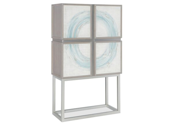 Bar cabinet with handpainted linen circle-design doors in light gray, crafted from oak veneers and glass. Includes drawers, pull-out shelf, wine bottle storage, wine glass rack, adjustable glass shelf, mirrored back, and a touch-switch puck light.
