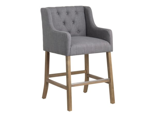 This console stool is crafted from Rubberwood solids and features a comfortable padded seat upholstered in Taupe Mist fabric. It is designed with square block legs and a built-in footrest for added support and includes nylon chair glides to protect floors