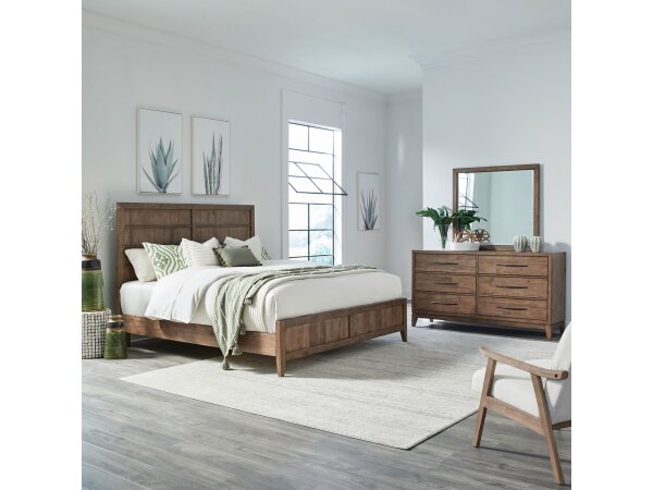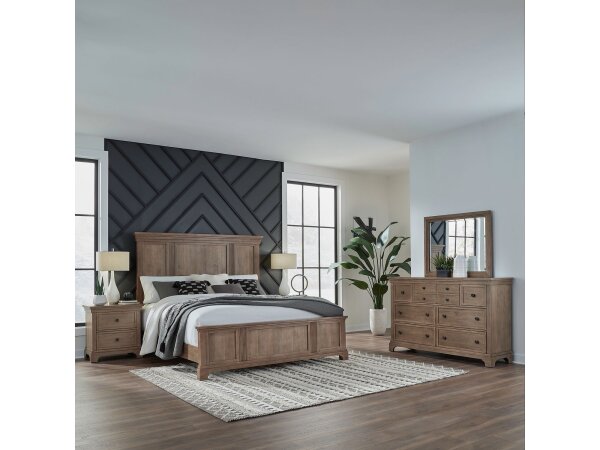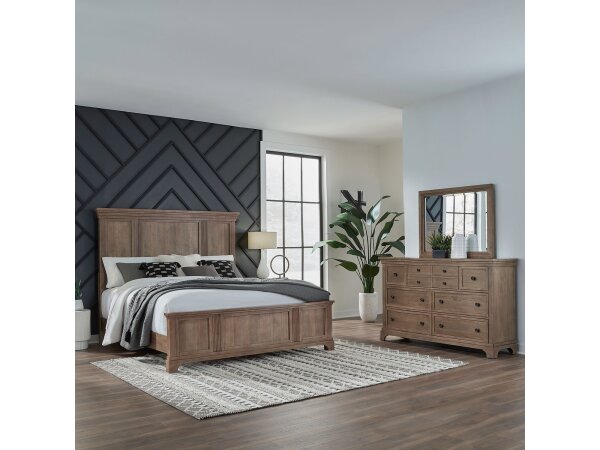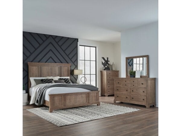 This complete bedroom set includes a queen panel bed, dresser, mirror, chest, and a nightstand with a built-in charging station. The convenient nightstand offers AC, USB-A, and USB-C ports, while the set shares features like premium drawer linings and bur
