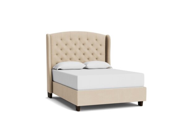 Classic tufted upholstered bed with graceful curves and decorative wings. Customize in your choice of fabric; choose a headboard or a complete bed with tapered or turned wood legs, in sizes Twin–Cal King.