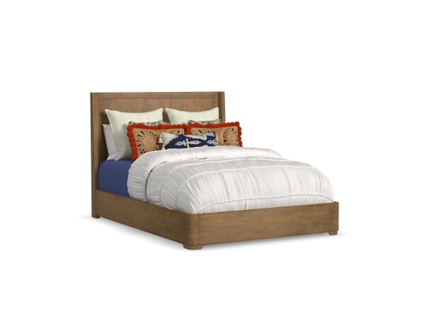 Two-tone gray washed oak and textured light gray King upholstered panel bed crafted with oak veneers and Macrame Artic fabric; includes headboard, footboard and rails. Headboard can be used alone.
