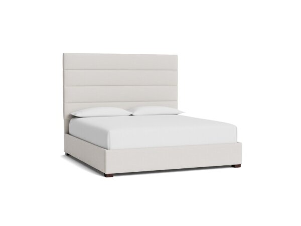 An upholstered platform bed in soft neutral fabric with a low-profile, flange-welted headboard and clean block legs. No foundation required; available in multiple sizes.